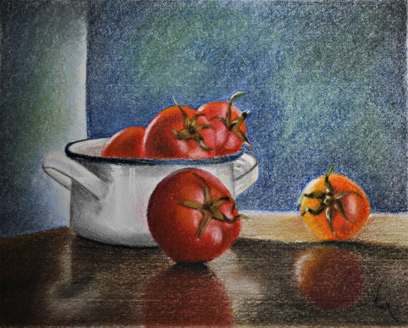 This is pastel pencils and soft pastels on ingres paper. I hate this paper, but I have a whole pad of it, so I am determined to use it up. LOL! This is the second piece that I have done for my kitchen walls.