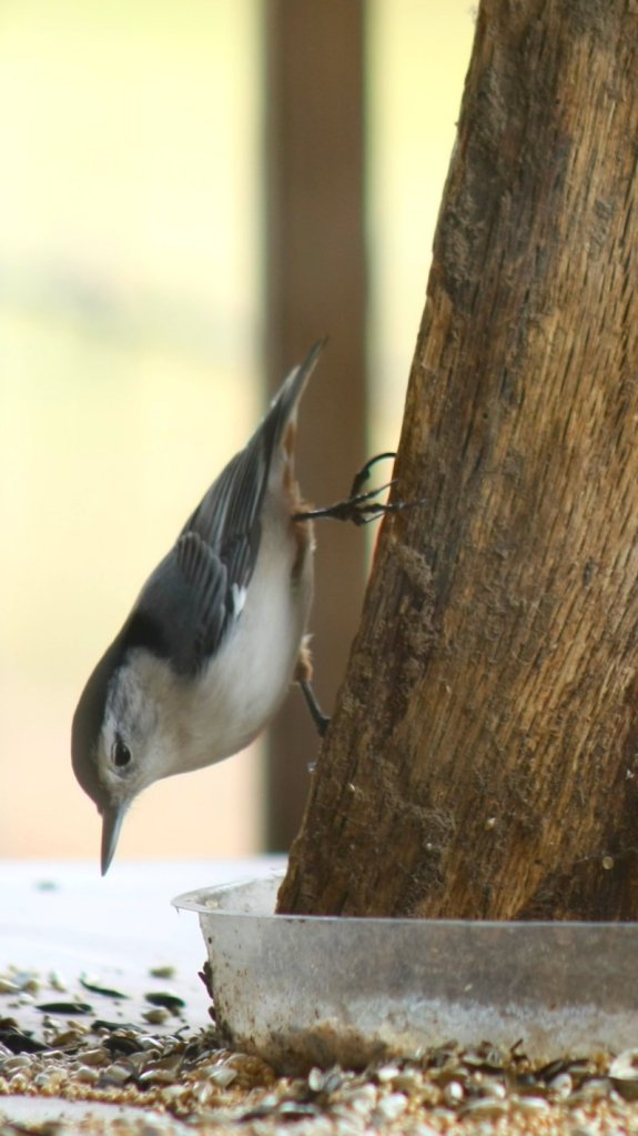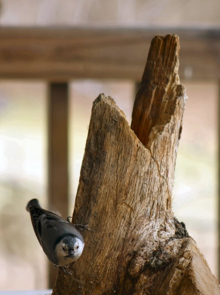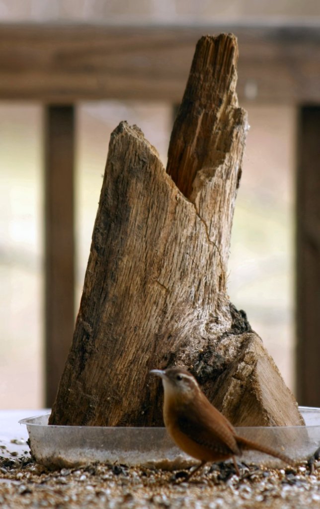 I have a table set up on the back porch with scattered bird seed, a couple of saucers with seed, a flower pot with seed, and a nice artistic piece of firewood standing in one of the saucers. The birds apparently agree with me that it is quite appealing. Out of 500 photos taken so far, I have gotten about 15 good ones. Here are a few: