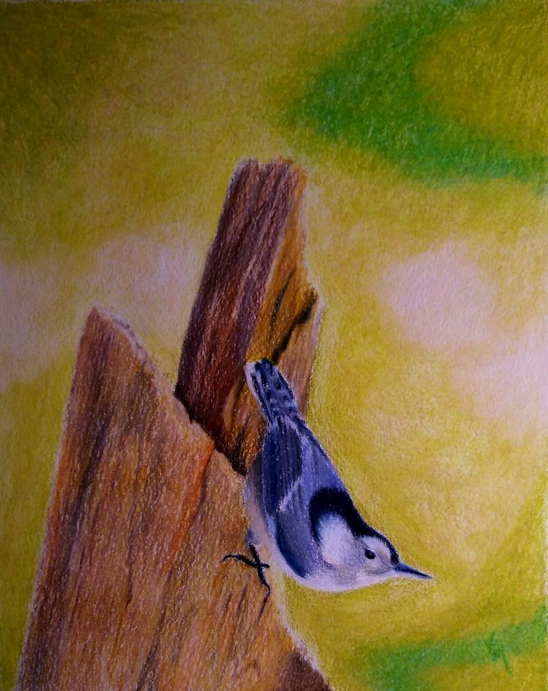 Mr. Nuthatch was the one that landed on the wood most often. I had the camera focused on the wood and the bird had to land right on the right spot to be focused. That is why the Caroline Wren on the bottom is not sharp, but the wood is sharp. LOL! Well, I have begun trying to learn colored pencils with my own reference photos: