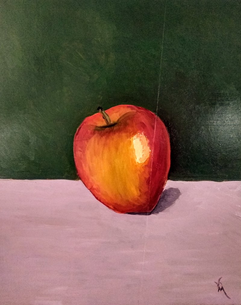 Some more fun with oil painting. I am painting over some acrylic disasters while I am practicing my oil painting, so that is why there is a ridge down the apple picture. LOL! No, it is not some obscure emotional symbol. The apple, with it’s green companion of the other day, may well adorn my kitchen one of these days. The cottage, below, was fun to paint. I held my long brushes at the very end and tried to make it loose and painterly. I think I got it. LOL! Nothing great, but great fun.
