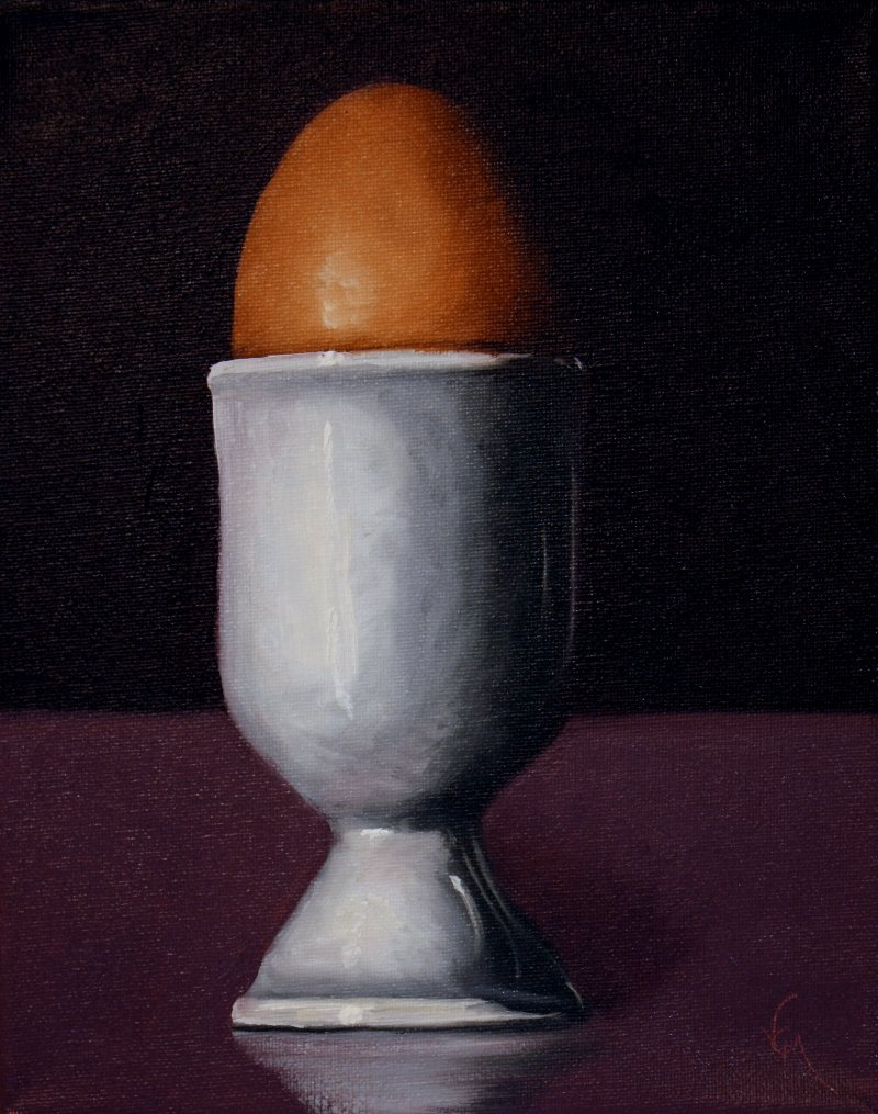 Okay, now for Eggbert. My first painting in my new studio. This is oils on an 8×10 stretched canvas. I really enjoyed painting this. I found myself singing while painting. I used yellow ochre, naphthol red, burnt umber, ultramarine blue, and titanium white, and a little linseed oil. I used two brushes, one for the background and eggcup and one for the egg. By the way, do you know which came first, the egg or the eggcup? Have any of you ever used an eggcup? Have any of you ever eaten soft boiled eggs? I don’t recall doing either of them, myself. I love a nice runny yolk with fried eggs, although we don’t eat eggs, anymore, and we don’t have chickens, either. That’s another story. Well, without further eloquence, allow me to introduce Eggbert: