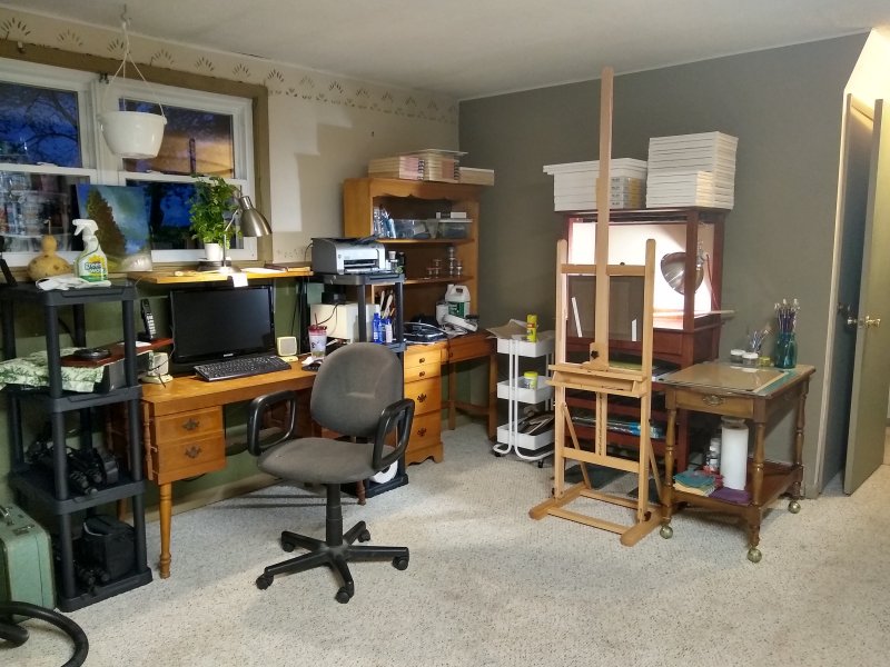 Now the after. This photo is just one corner, but it is the painting and computer areas. I have my still life stand, which is actually a wine rack which is built for bottles underneath and glasses to hang from the top. I taped some cardboard along two sides and hung a light on the side and it works great. I will need some dimmer bulbs, because the light is way too bright. I am still not finished with the little things like putting things where they belong and cleaning details, but it is looking so much better. I love having floor space to walk around and breathing space. We also installed two LED lights in the middle of the room and it is almost like stadium lights when they come on. When I first turned them on, I thought, “We built it and now they will come.” Who is coming? I don’t know….