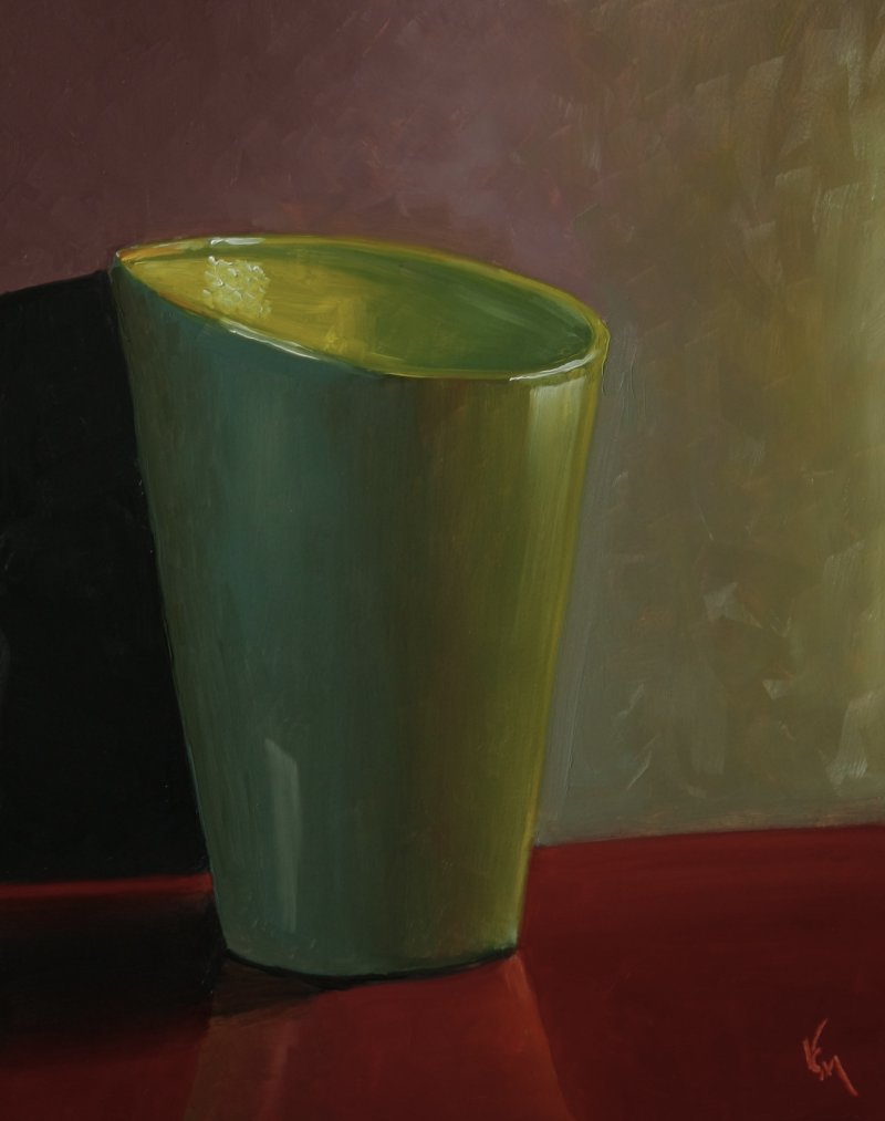 This is a lovely little crooked vase that I set up in my light box. I initially had put a mirror behind it, but that proved too complicated. At least for right now. So, I turned the mirror around and adjusted the lamp. I think it made some nice shadows and reflections. The light from the window also caused some nifty glints. Unfortunately, it also caused glints in the wet paint. When it is dry, I don’t think you will see the brush marks as easily.