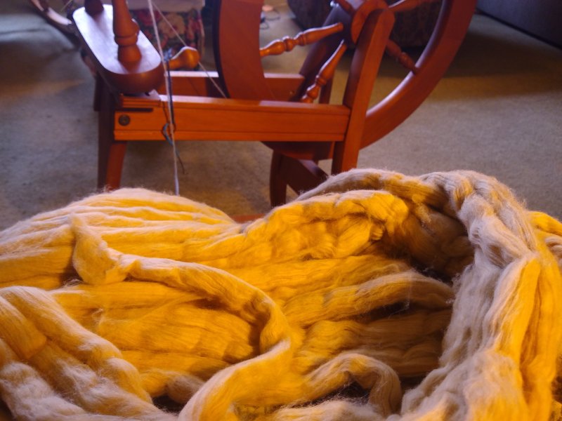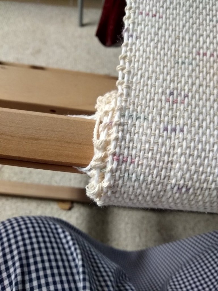 Showing the warp. You can also see a warp thread that is tighter than the rest. That thread had a knot in it from manufacturing. While I was winding the warp, I just forced it through the heddle, but didn’t realize how it would affect the weaving. So, when I got to it during the weaving process, I had to stop, force it through the heddle, again, and weave without using the heddle/beater until I was past the knot. I used a comb and it was not as neat and tight as the rest of the weaving. LOL! I am always learning something the hard way. After I got the knot taken care of, that thread was stretched all out of whack, so I had to put a weight on it to keep it tight until I finished. The weight was more than I needed, so that is what you see.Nice tight edge. Not perfect, but so much better.You can see some of the loosey-goosey edges that have already been wrapped on the beam.Getting ready to take it off the loom.Yay! It looks good, considering.After putting through the washer and dryer it tightened up and softened up. I love it! To cut it apart, I sewed a very short zigzag stitch on my machine and then cut right next to the seam. I don’t care much for fringe and to turn over a hem would be much too bulky. I love it just the way it is. I don’t know what I want to do with that long piece. I may cut it up into dishcloths, too.A lucet which I found while tidying up the studio. This is a tool used for making strong cord out of any thread. They come in various sizes from teeny-tiny to big enough for a large rope. When I found it, I took a short piece of purple yarn and tried to remember how to use it. You can see that at first it is loose while I am trying to get the rhythm. Then, at the end, I got it.Ready, with some misgivings, to try to spin cotton on Clara The Faithful Spinning Wheel.Well, that thread doesn’t look half bad.It works! I don’t know why I had such a hard time before, but it works this time. Part of it may be that I have little to no tension. Before, I had the tension set as for wool and the cotton would not stay in my hand, let alone actually set a twist. Now, I have plenty of time to get some twist into the yarn before feeding it onto the spool. It is so soft and silky. Beautiful!I got my order of warp yarns and started warping the loom, again. I am going to try to make dish towels. I was very ambitious and warped across the whole loom. Whew! I think I took on a little more than I can handle, with the warping. I have a feeling it will be a circus when I get back to it.