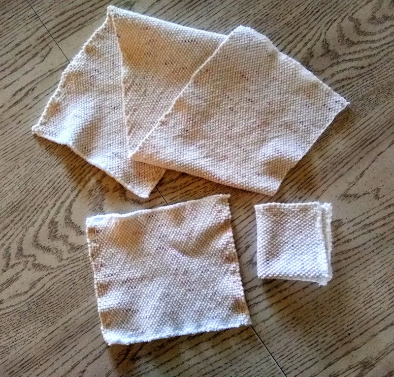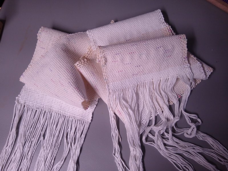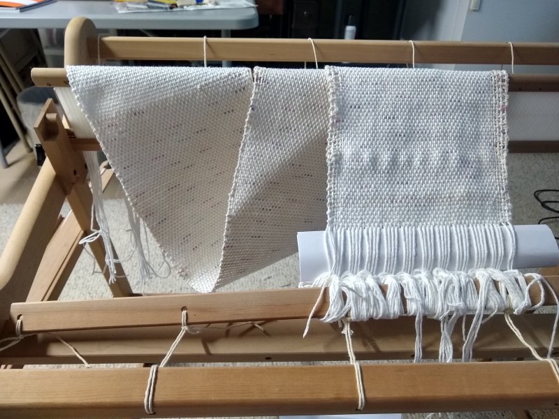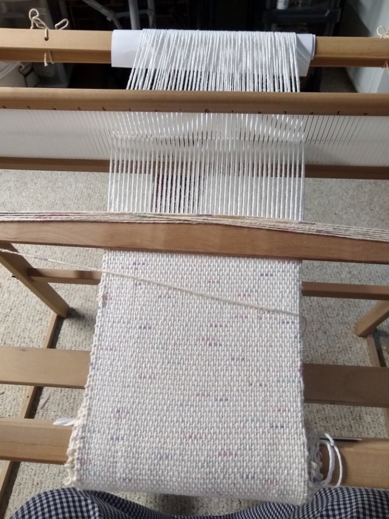 I am going like gangbusters with the fiber arts, right now. I found some crochet cotton in my stash, warped with the white, and used some multicolored for the weft and made a few dishclothes. During that weaving, I discovered how to tighten up the edges, so the end of the weaving is the best part, but it is all useable.