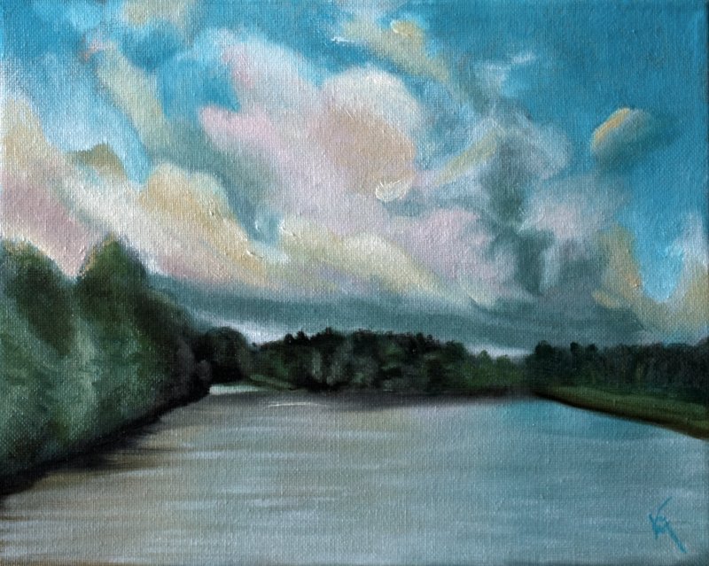 The photo for this painting was taken one early morning when Ron and I had been out scoping the area for fishing places. When we left the house, it was dark. While standing on the dock beside one of the boat ramps, the sky went wild. I love a good sunrise. And a good sunset. Who doesn’t?