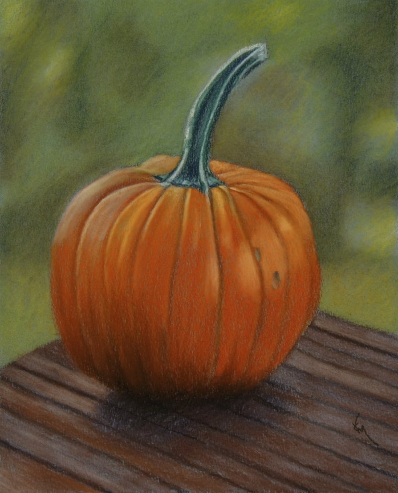Yes, this is health food. Pumpkin is good for you, all that beta carotene, among other things. And we all know fruit is good and yummy. LOL! These are pastels on the same paper, but the fruit is on the textured side and the pumpkin is on the smooth side. What a difference.