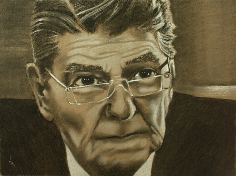 I recently found a very nifty book with photos of Ronald Reagan during his presidency. It is called Images of Greatness: An Intimate Look at the Presidency of Ronald Reagan. Such nifty pictures. I have chosen a few for portraits. One for a figure drawing. I will try to get to those over the next few months. This one has the following caption: “The president listens intently during a cabinet meeting. He sometimes wore reading glasses in the Cabinet Room and Oval Office.” This is charcoal on 12×16 light brown pastel paper.