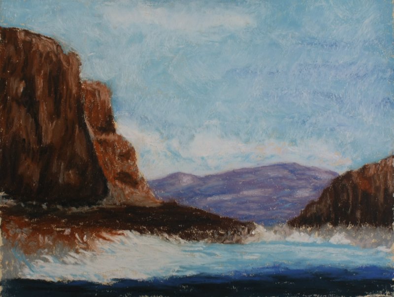 The Isle of Staffa is an uninhabited island in the Inner Hebrides of Scotland. It is mostly rock which stands in columns. This picture is soft pastels on 9×12 sanded paper.