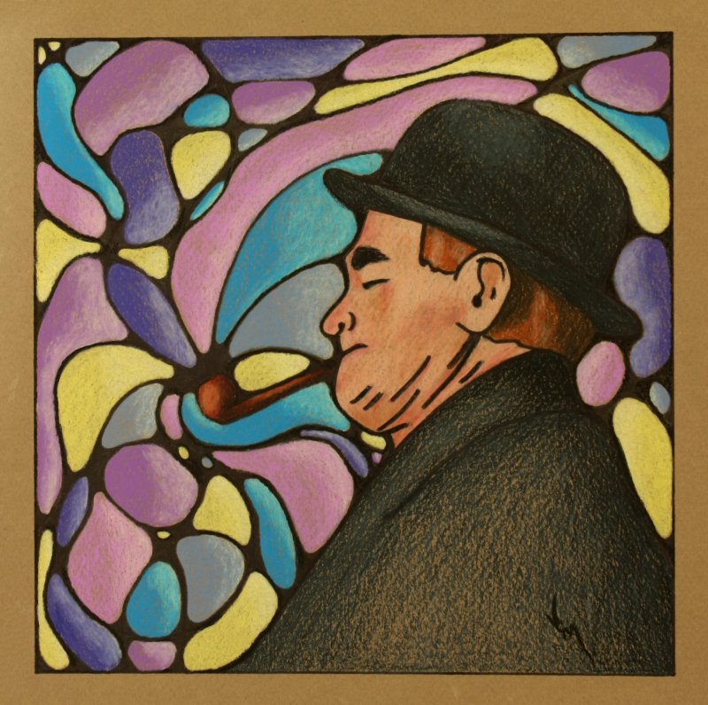 Mr. Michaeleen Og Flynn of Innisfree was never seen without his trusty pipe. It just wouldn’t be natural to do a portrait of him without it. And in this picture, he was obviously enjoying himself. Probably thinking about when he can next call at the pub. Yes, this is number three in my Quiet Man series. Ron is particularly enjoying this picture. It is 8.5 x 8.5 sharpie and colored pencils on brown pastel paper. I wanted to try a different paper and this one has more texture than the brown craft paper. I am always trying something different.