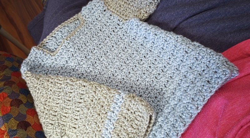 I started this blanket with scraps that I had collected over the years. I did not pay enough attention to the pattern as I was working it. It ended up using all my scraps before a quarter of the blanket was done and it became a queen-sized blanket. I was thinking lap blanket. LOL! What a dummy! I was just happily crocheting along and Ron actually went to Hobby Lobby and bought yarn for me. And Michael’s, too, I think…
