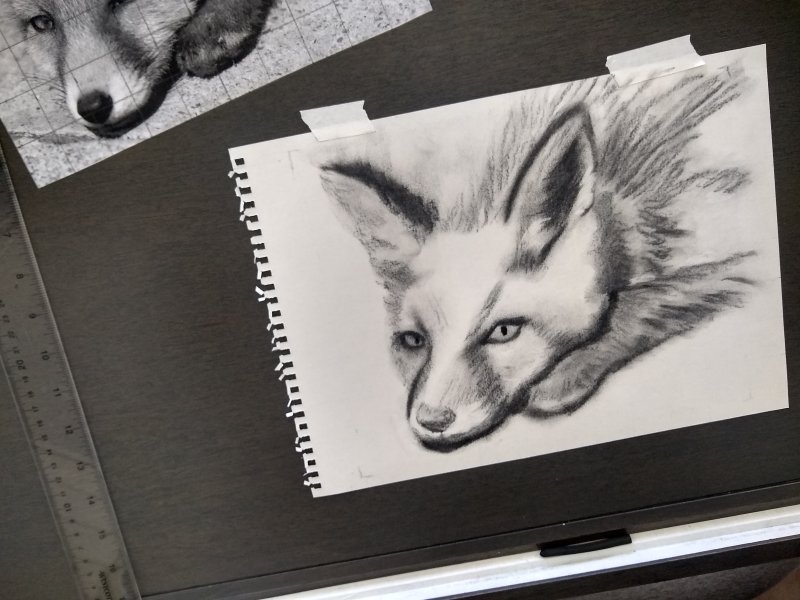 A half of a first paint layer. I loved the charcoal sketch so much that I was afraid to put the paint over it. It was hard. But, I think I will like it in the end.