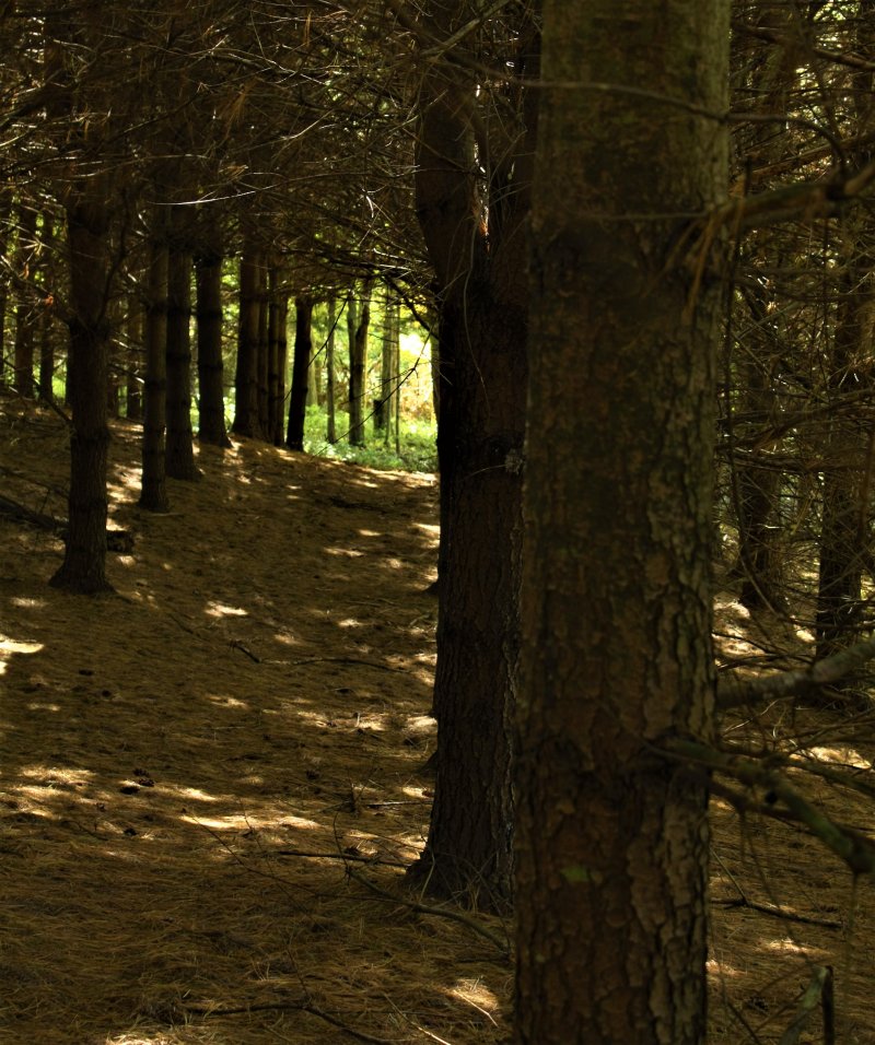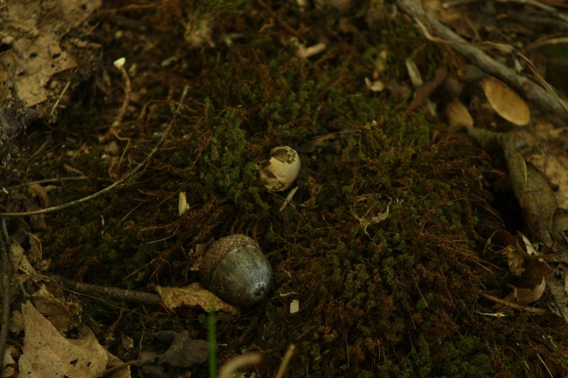 This is the main way through the pine woods.I moved over a little and aimed down the same way.Bonnie made this and said it was created by intelligent design. Of course!Beautiful woods.The chipmunks and squirrels were taunting me. I couldn’t catch them on camera. So, I settled on this fern.As I was getting set up to take the photo of the fern, I almost stepped on this little egg shell nestled in the moss with the acorn for company. I cleared some leaves off of it and thought it was nifty shot.Some hawthorn berries (haws) which I picked off one of our trees, today. They are so pretty on the tree, but I can’t get a good picture of it, because the berries don’t show up in my photos. Check out that thorn! I got one in my shoe the other day, which just missed my toe. Youch! That would have been bad.