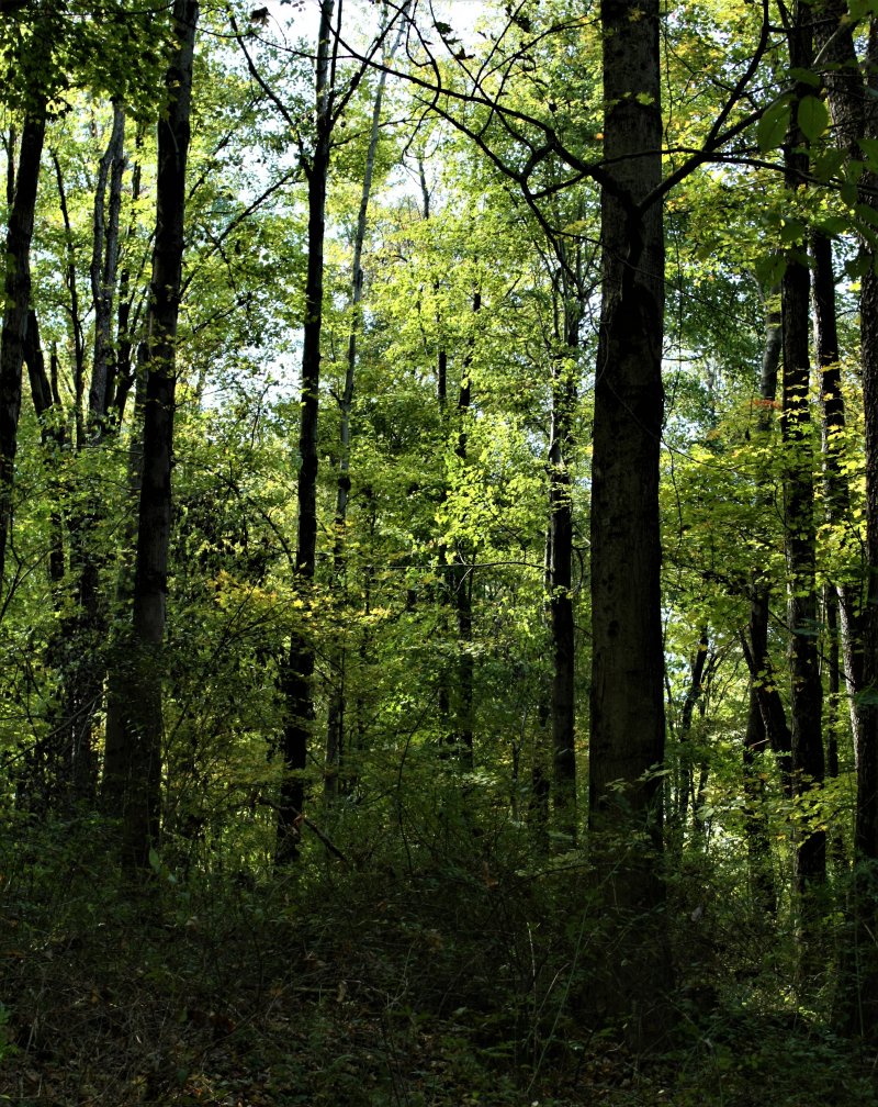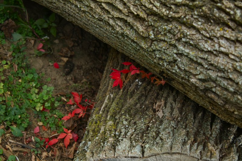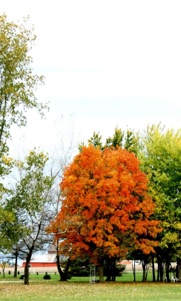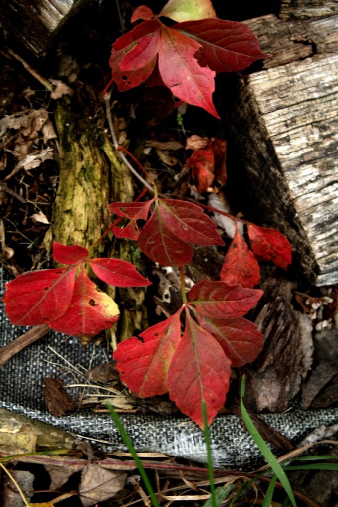The original of this one had an electric pole, a phone box, a stump, and some gasline markers in it. I did a lot of work to remove them. I like it better now. We have a big clump of wild asters in the back “nature preserve”. The Nature Preserve is a brush pile that is growing a few trees, blackberries, raspberries, goldenrod, poison ivy, and all kinds of other things. It is also home to many birds and small animals. We will not be burning it. It will rot down and grow trees.Our neighbors mulberry tree. We have an awful lot of mulberry trees around this neighborhood.A little Virginia creeper in our rotting log pile.Glamour shot of a lovely maple leaf. I tend to pick up every beautiful leaf that I see. I have to control myself because there are about a billion of them and I can’t keep picking them all up. LOL!The same mulberry tree. I love the dark trunk against the light leaves.Another neighbors beautiful tree.Not sure what this is. I thought it was Virginia creeper at first. Then I thought it was poison ivy. I don’t know. It is pretty, though.