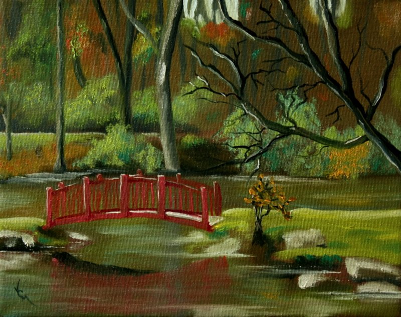 This is a little 8×10 oil painting of one of the bridges at Ariel Foundation Park in Mount Vernon, Ohio. I can’t seem to paint a straight line to save my life (unless I want a wavy line). LOL! Oh, well. This is from a photograph that I took a year or two ago during this time of year.