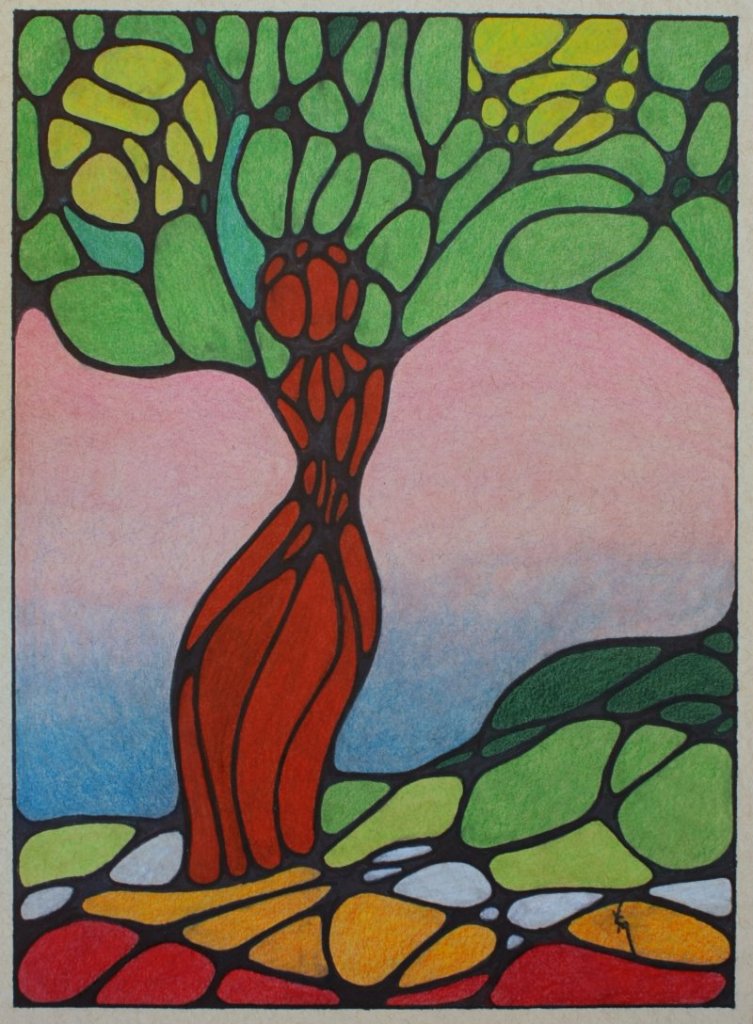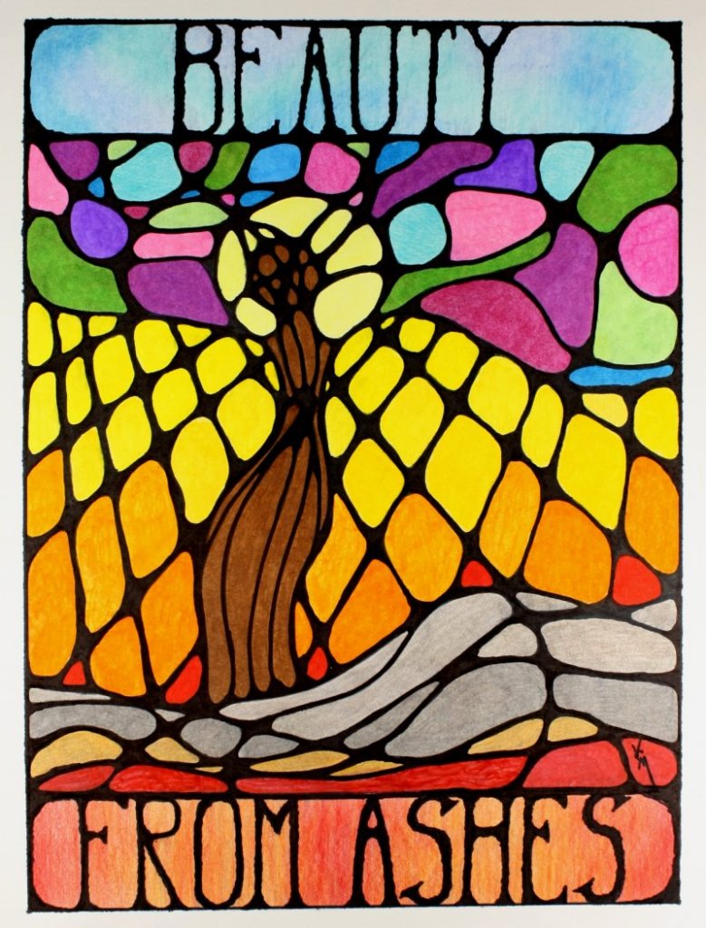 I tried to make the bottom of the picture to be flames, ashes, and new growth. The woman is me and the tree top is the beautiful fruit springing from my new life. Wouldn’t that be nice?