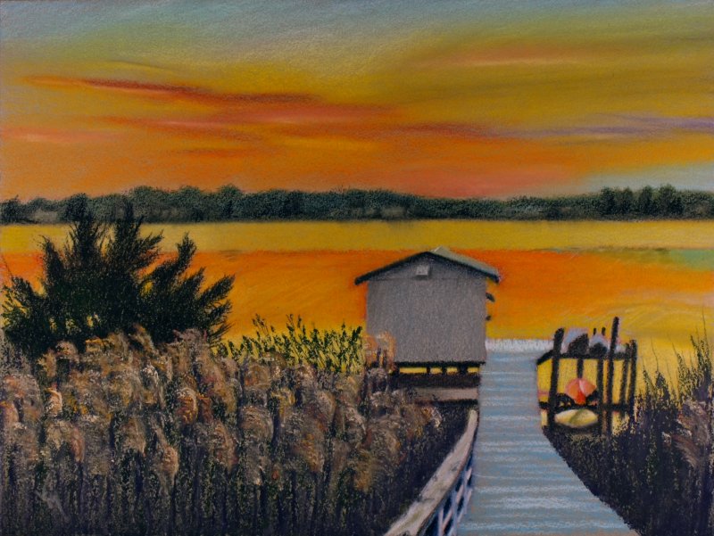 My latest commission is a 9×12 pastel pencil landscape on Canson toned sand-grain paper of the view from a house on the river in Virginia. It was certainly a lovely sunset. Aren’t they all? LOL! I love me a good sunset.