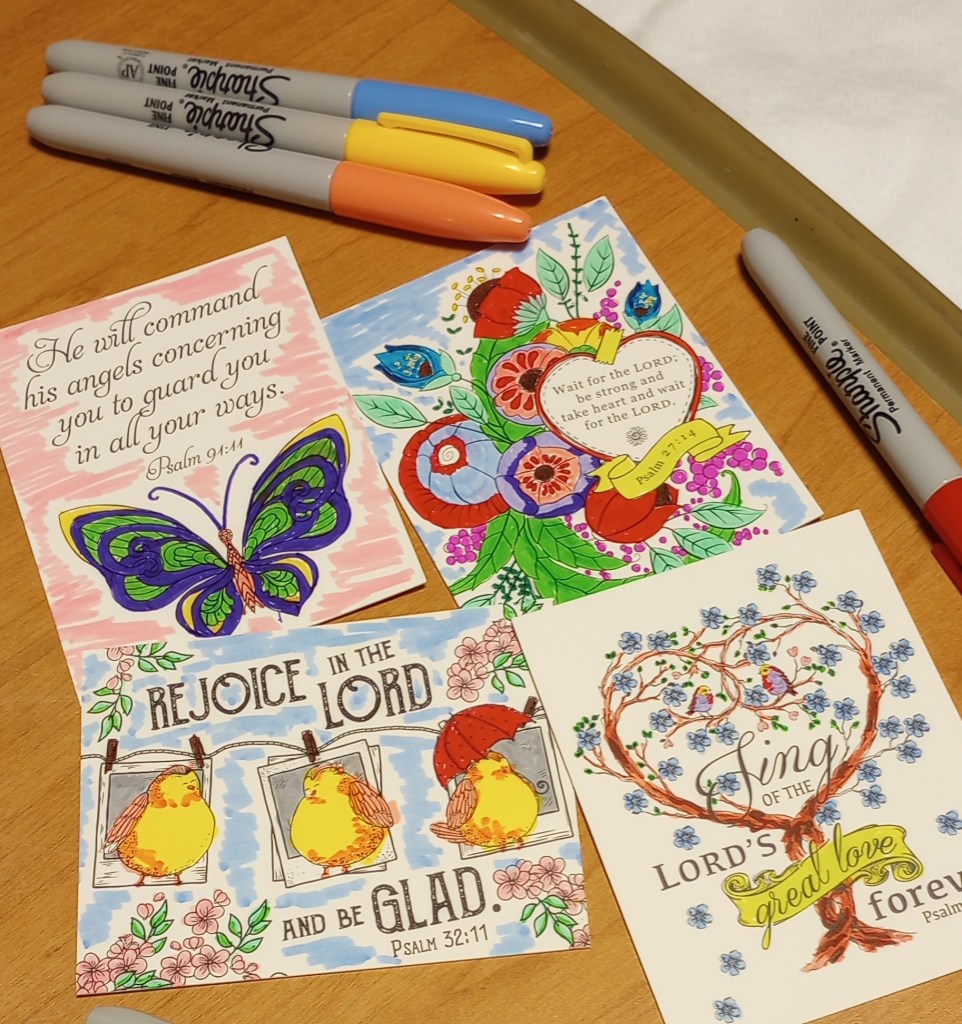 A friend sent me some coloring cards, so I have been doing art! Yay!!! I am giving them away here in the hospital. They even have a program here called Arts in Medicine where they give art supplies to patients so they can color, draw, do crafts, etc. Very nifty. And the art that is on the walls! I love it. I have gotten quite a few of the workers to slow down and look at it.