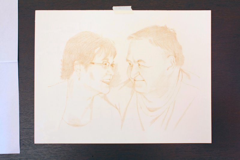 I have finally begun my latest portrait commission. I decided to do it in colored pencil and needed to do some practice with other things before I began. I am making it on a 12×16 piece of hot press watercolor paper with oil based colored pencils. This initial sketch is done with a very light brown pencil. I worried that I would not get the likeness or the loving look shared between them, but I am excited to say that I think I got it! Oh, joy! Oh, rapture! LOL!