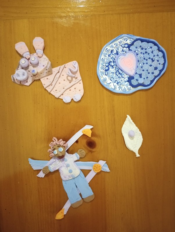 This is our clay masterpieces: “The Pig of Paree”, also known as “The Swine of the Seine”, created by yours truly; a prototype for a larger untitled work about the human heart by Jessica; a figure of a man who turned out to remind me of my grandma, so I call him “Grandma Man”; and a leaf with a purple pearl by Moi.