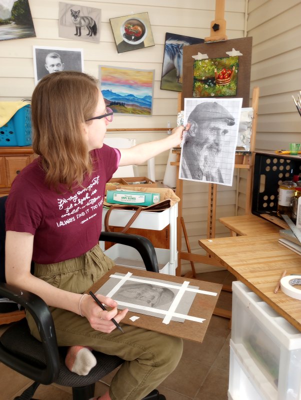 Jessica learned how to use a grid to catch the likeness. We printed the picture and decided to make the drawing half the size of the picture, so the picture has a one inch grid and the paper had a half-inch grid. It worked out well.